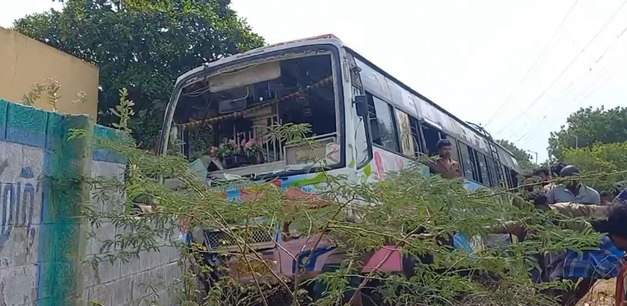 அப்போது பேருந்து கட்டுப்பாட்டை இழந்து சாலையின் மற்றொரு பகுதிக்கு சென்று அங்கிருந்த சாலையோர பள்ளத்தில் சரிந்து நின்றது.