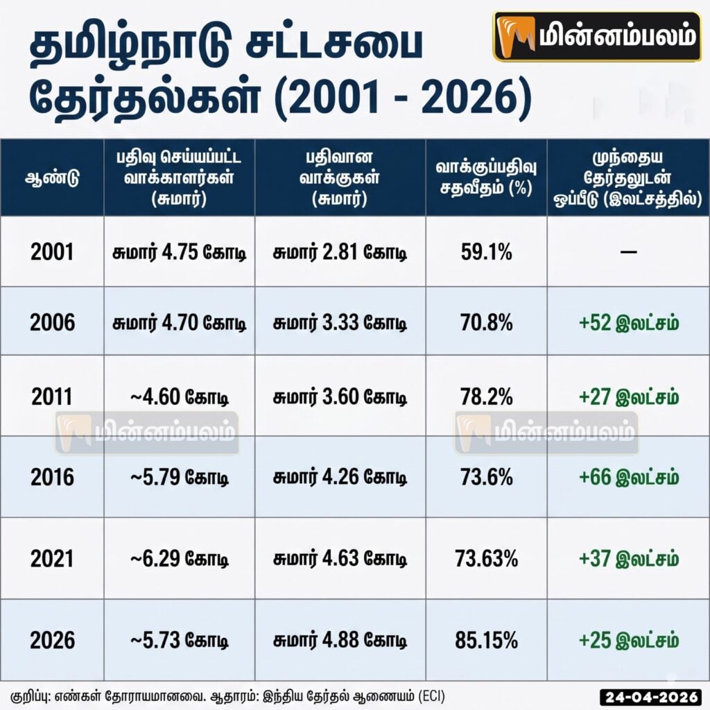 2021-ம் ஆண்டு தேர்தலை ஒப்பிடுகையில் 2026-ம் ஆண்டு சுமார் 25 லட்சம் வாக்காளர்கள் கூடுதலாக வாக்களித்துள்ளனர்.
