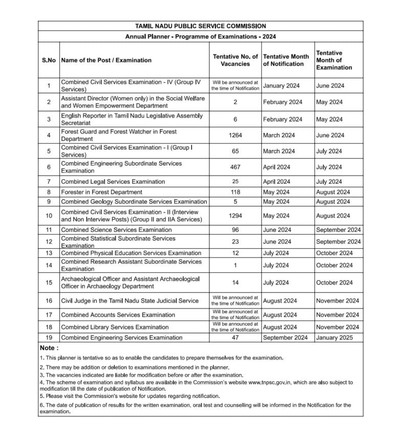 அதன்படி, 2024-ம் ஆண்டுக்கான தேர்வு கால அட்டவணை டிசம்பர் 15ஆம் தேதி வெளியாகும் என டிஎன்பிஎஸ்சி அறிவித்தது.