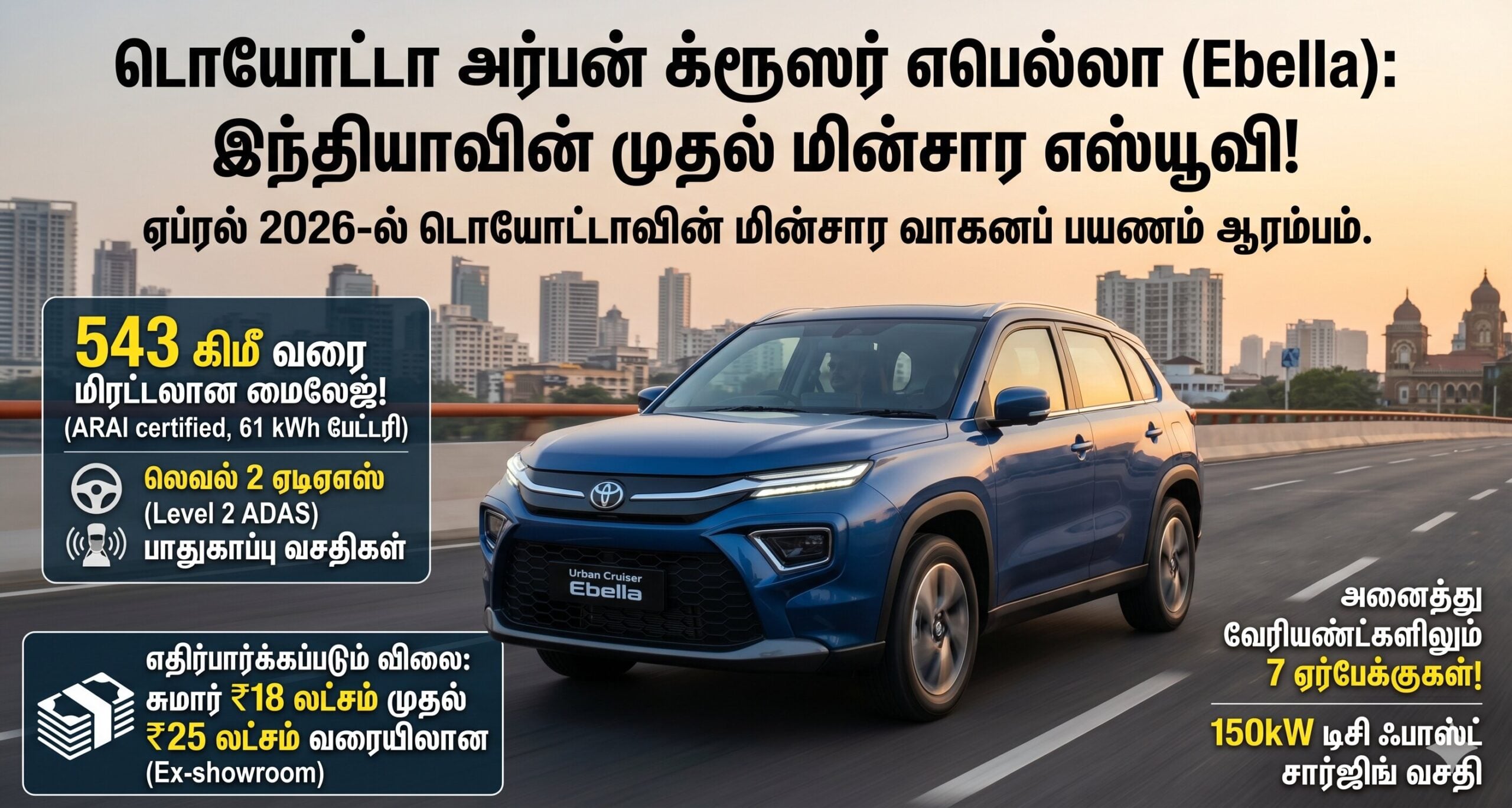 இந்திய கார் சந்தையில் பெரும் எதிர்பார்ப்பை ஏற்படுத்தியுள்ள டொயோட்டாவின் முதல் முழுமையான மின்சார எஸ்யூவி (All Electric SUV) அர்பன் க்ரூஸர் எபெல்லா (Urban Cruiser Ebella) இந்த வாரம் தனது விலையை வெளிப்படுத்தத் தயாராகிவிட்டது. ஏப்ரல் 2026-ல் டொயோட்டா தனது மின்சார வாகனப் பயணத்தை இந்தியாவில் இதன் மூலம் அதிகாரப்பூர்வமாகத் தொடங்குகிறது.