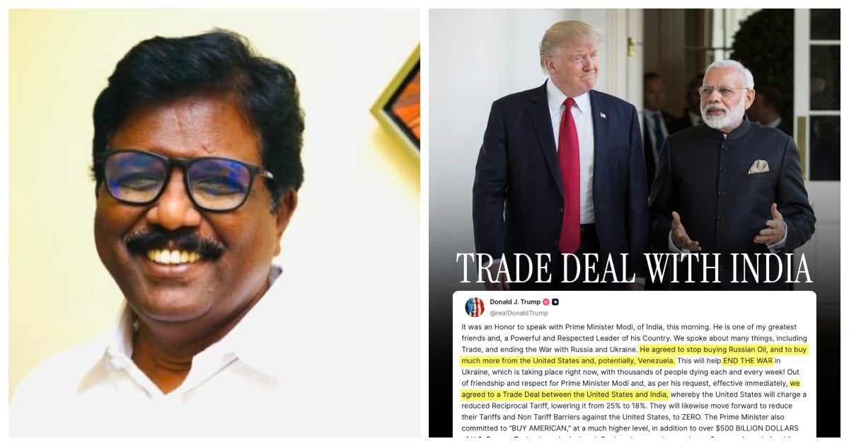 “அமெரிக்கா விதித்த வரியில் 7% குறைக்கும், ஆனால் இந்தியாவோ அமெரிக்காவிலிருந்து தான் இறக்குமதி செய்யும் பொருட்களுக்கு வரியே விதிக்கக்கூடாது. வரியை 0% ஆகக் குறைக்க வேண்டும். அமெரிக்காவுடனான வர்த்தக அளவை மேலும் 500 பில்லியன் டாலர் அளவுக்கு உயர்த்த வேண்டும்” என அமெரிக்கா விதித்த நிபந்தனைகளை இந்தியப் பிரதமர் ஏற்றுக்கொண்டதாக டிரம்ப் சொல்லியிருப்பது பிரதமர் மோடி ஒட்டுமொத்தமாக சரணடைந்திருப்பதையே காட்டுகிறது.