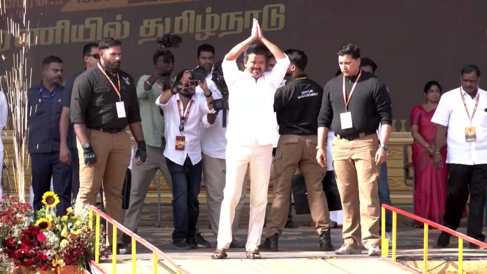 இதைத்தொடர்ந்து தவெக தலைவர் விஜய் மேடைக்கு வந்தார். தொண்டர்களை பார்த்து கையசைத்துக்கொண்டே வந்த விஜய், மேடையில் இருந்த தனது அப்பா, அம்மா உட்பட அனைவருக்கும் கைகொடுத்து கட்டியணைத்து அன்பை வெளிப்படுத்தினார்.