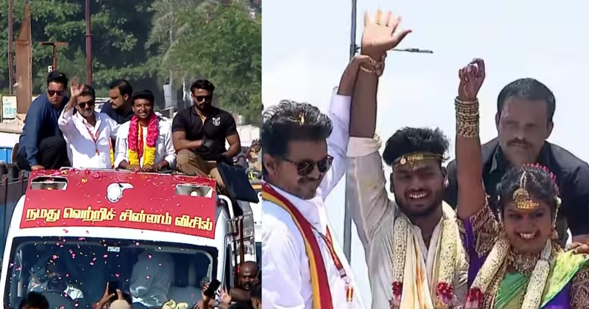 பொன்னேரி தொகுதியில் ரோடு ஷோ நடத்தியபோது விஜய், அம்பேத்கர் படத்தை காட்டி ஓட்டு சேகரித்தார். அப்போது, ரோடு ஷோவில் திருமணமான கையோடு சாலையோரம் நின்றிருந்த தம்பதியை கண்டதும் வேனில் ஏற்றி விஜய் வாழ்த்தினார்.