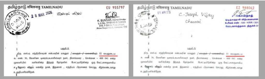 அதன்படி இன்று பெரம்பூர் தொகுதியில் திருத்தப்பட்ட வேட்பு மனு தாக்கல் செய்யப்பட்டது. விஜய் இன்று புதுச்சேரியில் பிரச்சாரத்தில் ஈடுபட்டிருக்கும் நிலையில், அவரது சார்பில் மாவட்டச் செயலாளர் சிவா புதிய பிரமாண பத்திரத்தை இன்று தேர்தல் அதிகாரியிடம் தாக்கல் செய்தார்.