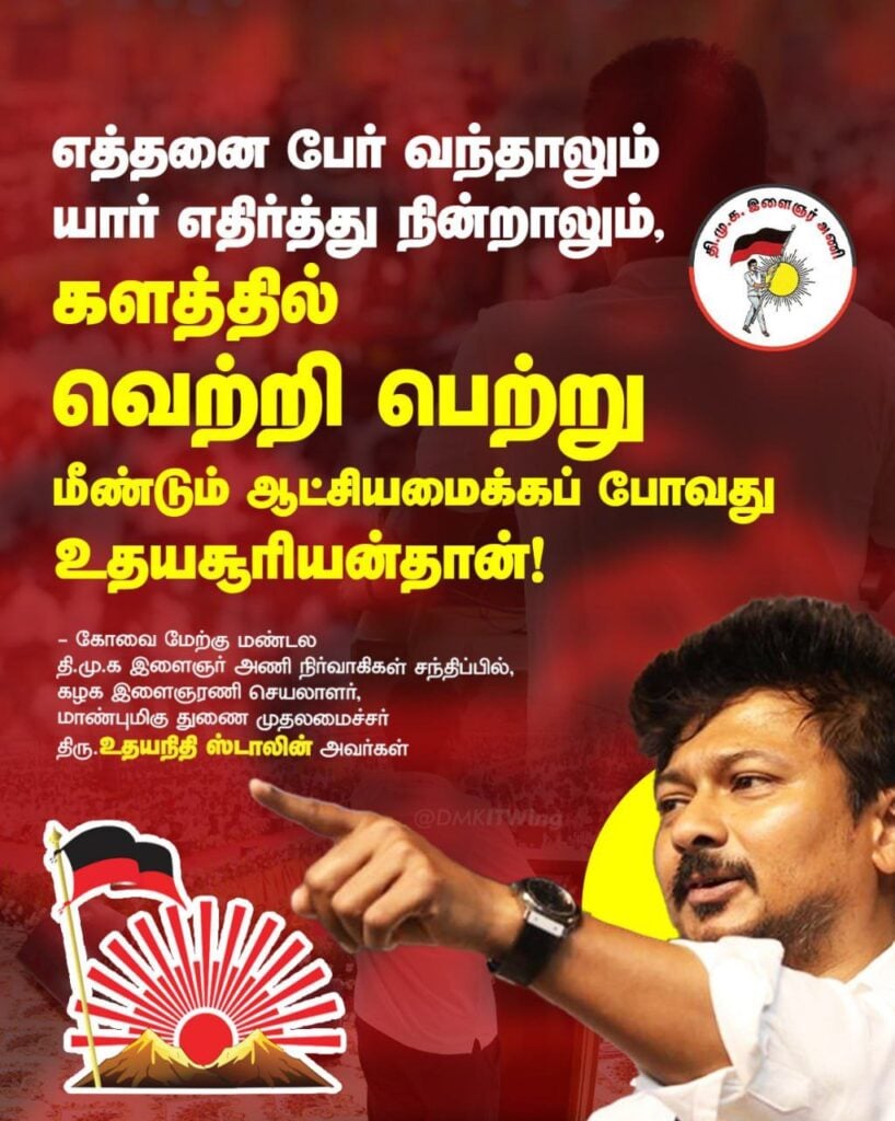 இன்னைக்கு சில பேர் நம்முடைய இயக்கத்தை அழிச்சிடலாம்னு பகல் கனவு காண்கிறாங்க.. . நம்மள யாராலயும் எந்த நேரத்திலும் அழிக்க முடியாது. பேரறிஞர் அண்ணா அவர்கள் ஏற்கனவே இதற்கான ஒரு பதிலைக் கொடுத்திருக்கிறார்கள். பேரறிஞர் அண்ணா சொன்னது, எங்கள அழிச்சு புதைக்கலாம்னு நீங்க நாலு அடிக்கு ஒரு குழியை வெட்டுவீங்க. நீங்கக் குழியை வெட்டுறதுக்குள்ள நாங்க ஆறடி வளர்ந்திருப்போம். உடனே எங்களுக்காக ஆறடிக்கு ஒரு குழியை வெட்டுவீங்க. நீங்கக் குழியை வெட்டுறதுக்குள்ள நாங்க எட்டு அடி வளர்ந்திருப்போம். உடனே எங்களுக்காக எட்டு அடிக்கு ஒரு குழியை வெட்டுவீங்க. அதுக்குள்ள நாங்க பதினாறு அடி வளர்ந்திருப்போம். நீங்க எங்கள வெட்ட நினைச்சீங்கன்னா நாங்க வளர்ந்துகிட்டே இருப்போம் அப்படின்னு பேரறிஞர் அண்ணா அவர்கள் நம்முடைய கழக இளைஞரணியை பார்த்துச் சொன்னார். அதே போல உங்களுக்கு நான் சொல்லுவதெல்லாம் இத்தனை ஆயிரம் உடன்பிறப்புகள் இருக்கின்ற வகையில் நாங்க வளர்ந்துகிட்டே தான் இருப்போம். தவிர உங்களால எங்கள அழிக்கவே முடியாது. இங்க கூடி இருக்கக்கூடிய லட்சக்கணக்கான இளைஞரணி தம்பி மார்கள் சார்பாக நான் மீண்டும் சொல்கிறேன் எங்களுடைய உதய சூரியன் அப்படிங்கிறது வெறும் ஏதோ செவுத்துல வரைஞ்சு வைக்கிற சின்னம் கிடையாது. கழக உடன்பிறப்புகள் ஒவ்வொருத்தர் அவர்களுடைய இதயத்திலும் ரத்தத்திலும் ஊறிப்போன சின்னம் உதய சூரியன். அண்ணா கண்டுபிடித்த சின்னம் உதய சூரியன். கலைஞர் கட்டிக்காத்த சின்னம் உதய சூரியன். தலைவர் அவர்களால வெற்றியை மட்டுமே பெற்றுக்கொண்டிருக்கக்கூடிய ஒரு சின்னம் உதய சூரியன். உயிர் போனால் போகுமே தவிர உதய சூரியன் எங்களை விட்டுப் போகாது. எத்தனை பேர் வந்தாலும் யாரு எங்களை எதிர்த்து நின்னாலும் களத்தில் ஜெயிச்சு மீண்டும் ஆட்சி அமைக்கப்போறது உதய சூரியன் தான்.