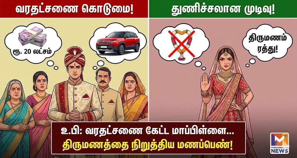 திருமணம் என்பது இரு மனங்கள் இணையும் ஒரு விழா. ஆனால், இன்றும் பல இடங்களில் அது ஒரு “வியாபாரமாகவே” பார்க்கப்படுகிறது என்பதற்குச் சாட்சியாக உத்தரப் பிரதேசத்தில் ஒரு அதிர்ச்சிச் சம்பவம் நடந்துள்ளது. தாலி கட்டும் நேரத்திற்குச் சற்று முன்பு, மாப்பிள்ளை வீட்டார் 20 லட்சம் ரூபாய் ரொக்கமும், ஒரு காரும் கேட்டதால், மணப்பெண் துணிச்சலாகத் திருமணத்தையே நிறுத்திய சம்பவம் இந்தியா முழுவதும் பேசுபொருளாகியுள்ளது.
