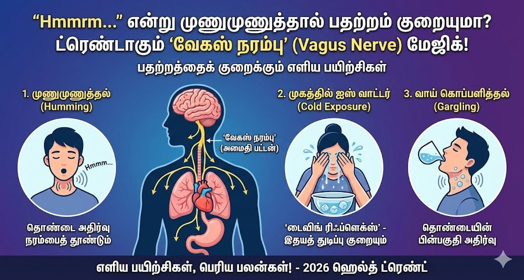 இதற்கு மருந்துகள் தேவையில்லை; செலவு செய்ய வேண்டியதில்லை. வெறும் குளிர்ந்த நீரோ அல்லது “ம்ம்ம்ம்…” என்ற முணுமுணுப்போ போதும் என்கிறது 2026-ன் புதிய ஹெல்த் ட்ரெண்ட். சமூக வலைதளங்களில் தற்போது ‘வேகஸ் நரம்புத் தூண்டல்‘ (Vagus Nerve Stimulation) பயிற்சிகள் படு வைரல்!