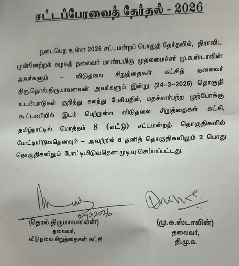 இந்த ஒப்பந்தத்தில், “”நடைபெற உள்ள 2026 சட்டமன்றப் பொதுத் தேர்தலில், திராவிட முன்னேற்றக் கழகத் தலைவர் மாண்புமிகு முதலமைச்சர் மு.க.ஸ்டாலின் அவர்களும் – விடுதலை சிறுத்தைகள் கட்சித் தலைவர் திரு.தொல்.திருமாவளவன் அவர்களும் இன்று (24-3-2026) தொகுதி உடன்பாடுகள் குறித்து கலந்து பேசியதில், மதச்சார்பற்ற முற்போக்கு கூட்டணியில் இடம் பெற்றுள்ள விடுதலை சிறுத்தைகள் கட்சி, தமிழ்நாட்டில் மொத்தம் 8 (எட்டு) சட்டமன்றத் தொகுதிகளில் போட்டியிடுவதெனவும் – அவற்றில் 6 தனித் தொகுதிகளிலும் 2 பொது தொகுதிகளிலும் போட்டியிடுவதென முடிவு செய்யப்பட்டது” என தெரிவிக்கப்பட்டுள்ளது.