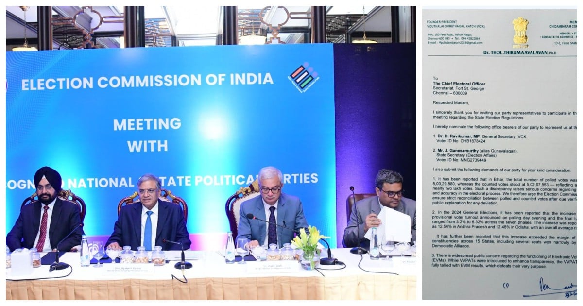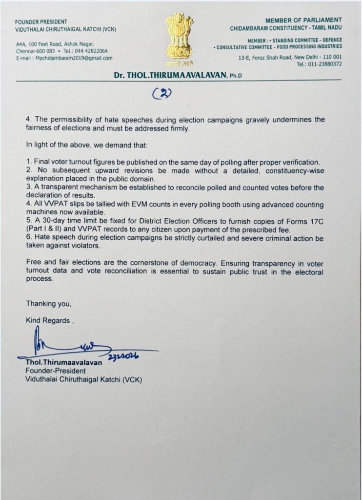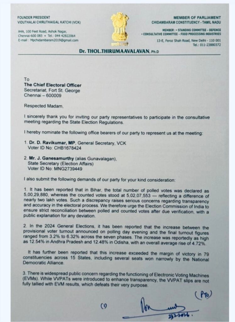 தலைமைத் தேர்தல் ஆணையரிடம் விசிக சார்பில்,