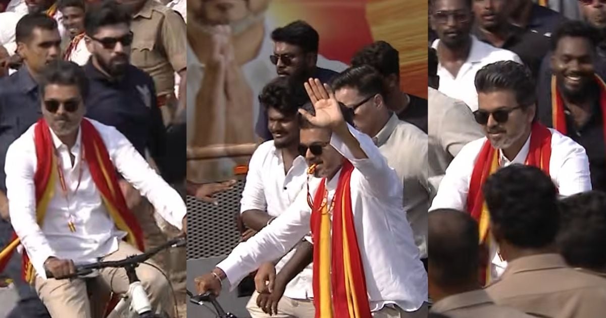 இதையடுத்து, விஜய் சற்று நேரத்திற்கு முன்பு கூட்டம் நடைபெறும் இடத்திற்கு வந்தவர் அந்த இடத்தை சைக்கிளில் சுற்றி வாக்கு சேகரிப்பில் ஈடுபட்டார். விஜய் சைக்கிளில் சுற்றியபோது அவரது பாதுகாவலர்களும், காவலர்களும் பின்னால் ஓடிச் சென்றனர்.