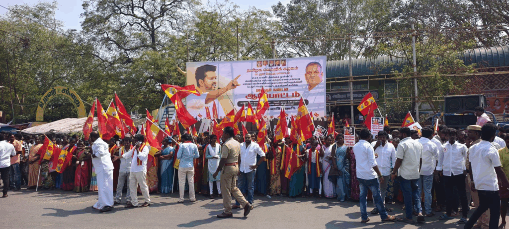 இதில் தவெகவினர் அதிகளவில் பங்கேற்று தமிழக அரசுக்கு எதிராக கோஷம் எழுப்பி கண்டனம் தெரிவித்தனர். ஆனால் அனுமதியின்றி போராட்டம் நடத்துவதாக கூறி அவர்களை போலீசார் கைது செய்து வேனில் ஏற்றி சென்றனர். இது தமிழகம் முழுவதும் பரபரப்பை ஏற்படுத்தியது.