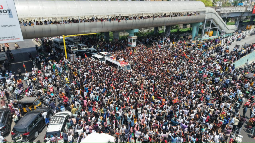 கடைசியா இந்த நாலு முனை போட்டி, 40 முனை போட்டி… எத்தனை முனை போட்டி எத்தனை உருட்ட உருட்டினாலும் இங்க இரண்டு முனை போட்டிதான். ஒன்னு டிவிகே, இன்னொன்னு திமுக. மக்கள் விரோத ஆட்சி நடத்துற ஸ்டாலின் சார் வேணுமா? மக்களை நேசிக்கிற இந்த விஜய் வேணுமா? அவ்வளவுதான் இந்த எலக்ஷன். அதனால உங்க பிள்ளைக்கு, உங்க மகனுக்கு, உங்க அண்ணனுக்கு, உங்க தம்பிக்கு, உங்க விஜய்க்கு ஒரே ஒரு வாய்ப்பு கொடுங்க. தயவு செஞ்சு விசில் சின்னத்துக்கு ஓட்டுப் போடுங்க. இது ஒரு விசில் புரட்சி தேர்தலா இருக்கணும்.