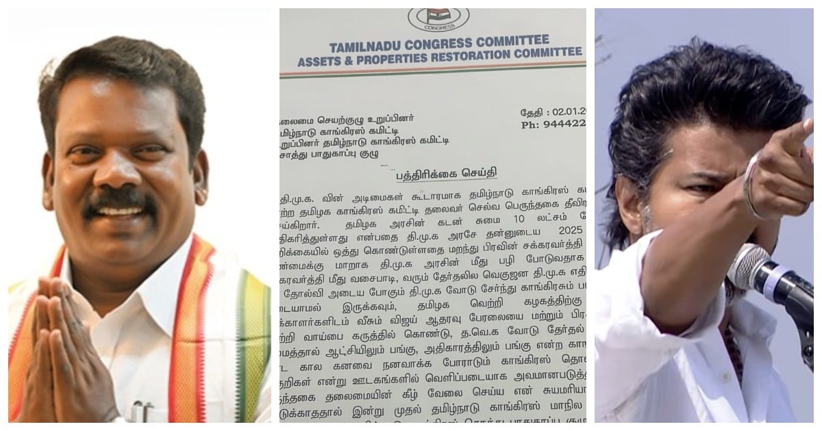 விஜய்யின் தமிழக வெற்றிக் கழகத்துடன் (Vijay TVK Congress) கூட்டணி வைக்க தமிழக காங்கிரஸ் கமிட்டித் தலைவர் செல்வப்பெருந்தகை எதிர்ப்பு தெரிவிப்பதால் காங்கிரஸ் கட்சியில் இருந்து விலகுவதாக அக்கட்சியின் சொத்து பாதுகாப்பு குழு மற்றும் செயற்குழு உறுப்பினர் சூர்ய பிரகாசம் தெரிவித்துள்ளார்.
