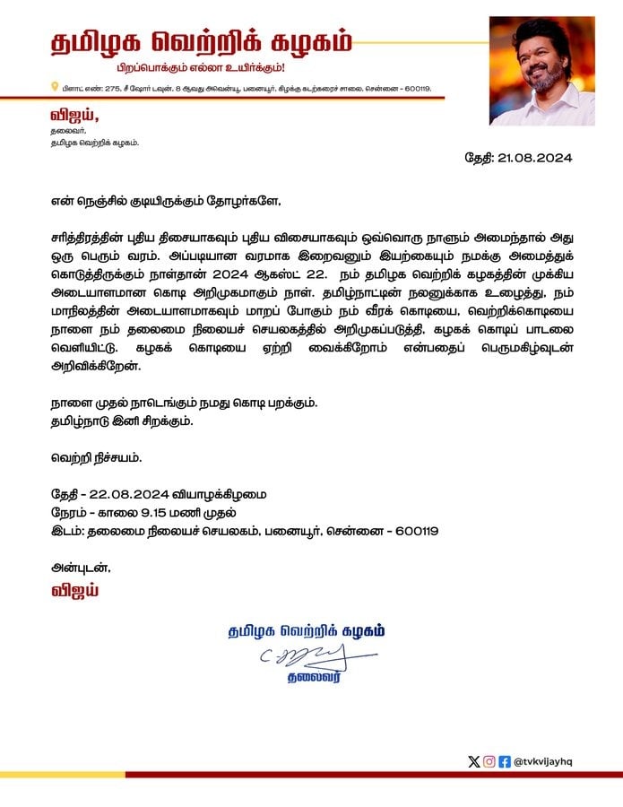 நம் தமிழக வெற்றிக் கழகத்தின் முக்கிய அடையாளமான கொடி அறிமுகமாகும் நாள். தமிழ்நாட்டின் நலனுக்காக உழைத்து, நம் மாநிலத்தின் அடையாளமாகவும் மாறப் போகும் நம் வீரக் கொடியை, வெற்றிக்கொடியை நாளை நம் தலைமை நிலையச் செயலகமான சென்னை பனையூரில் காலை 9.15 மணிக்கு அறிமுகப்படுத்தி, கொடிப் பாடலை வெளியிட்டு கொடியை ஏற்றி வைக்கிறோம் என்பதைப் பெருமகிழ்வுடன் அறிவிக்கிறேன். நாளை முதல் நாடெங்கும் நமது கொடி பறக்கும். தமிழ்நாடு இனி சிறக்கும் “ என்று தெரிவித்துள்ளார்.
