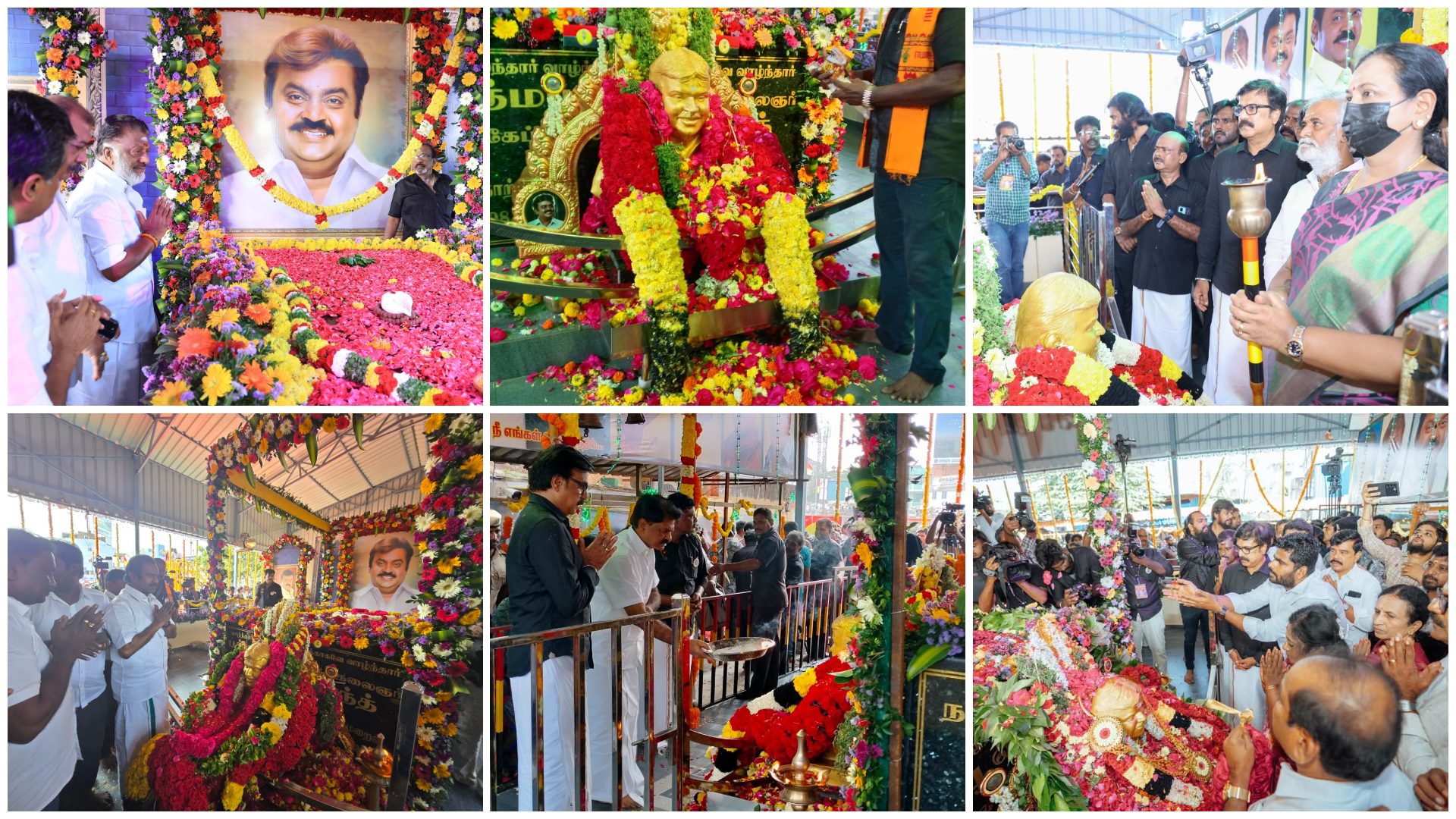 தொடர்ந்து பல்வேறு அரசியல் கட்சி தலைவர்களும் விஜயகாந்த் நினைவிடத்திற்கு நேரில் வருகை தந்து மலர் அஞ்சலி செலுத்தினர்.