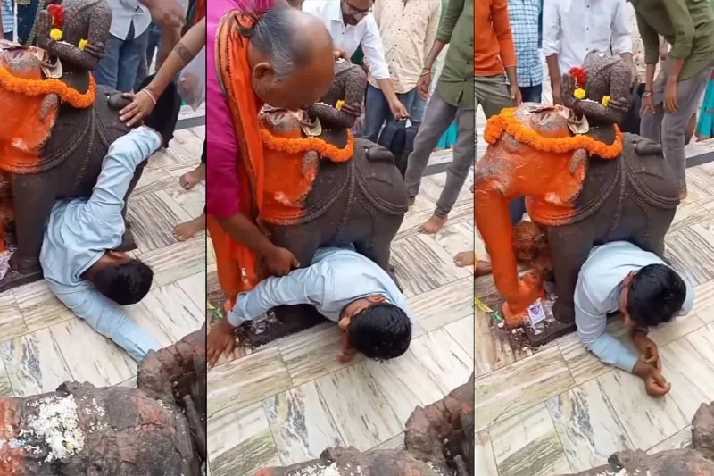 நிதின் என்ற ட்விட்டர் பயனர் தனது சமூக வலைதளப் பக்கத்தில் வெளியிட்டுள்ள வீடியோவில், கோவிலில் உள்ள யானை சிலையை ஒருவர் தரிசித்தபோது சிலையின் அடியில் தற்செயலாக மாட்டிக்கொள்கிறார்.