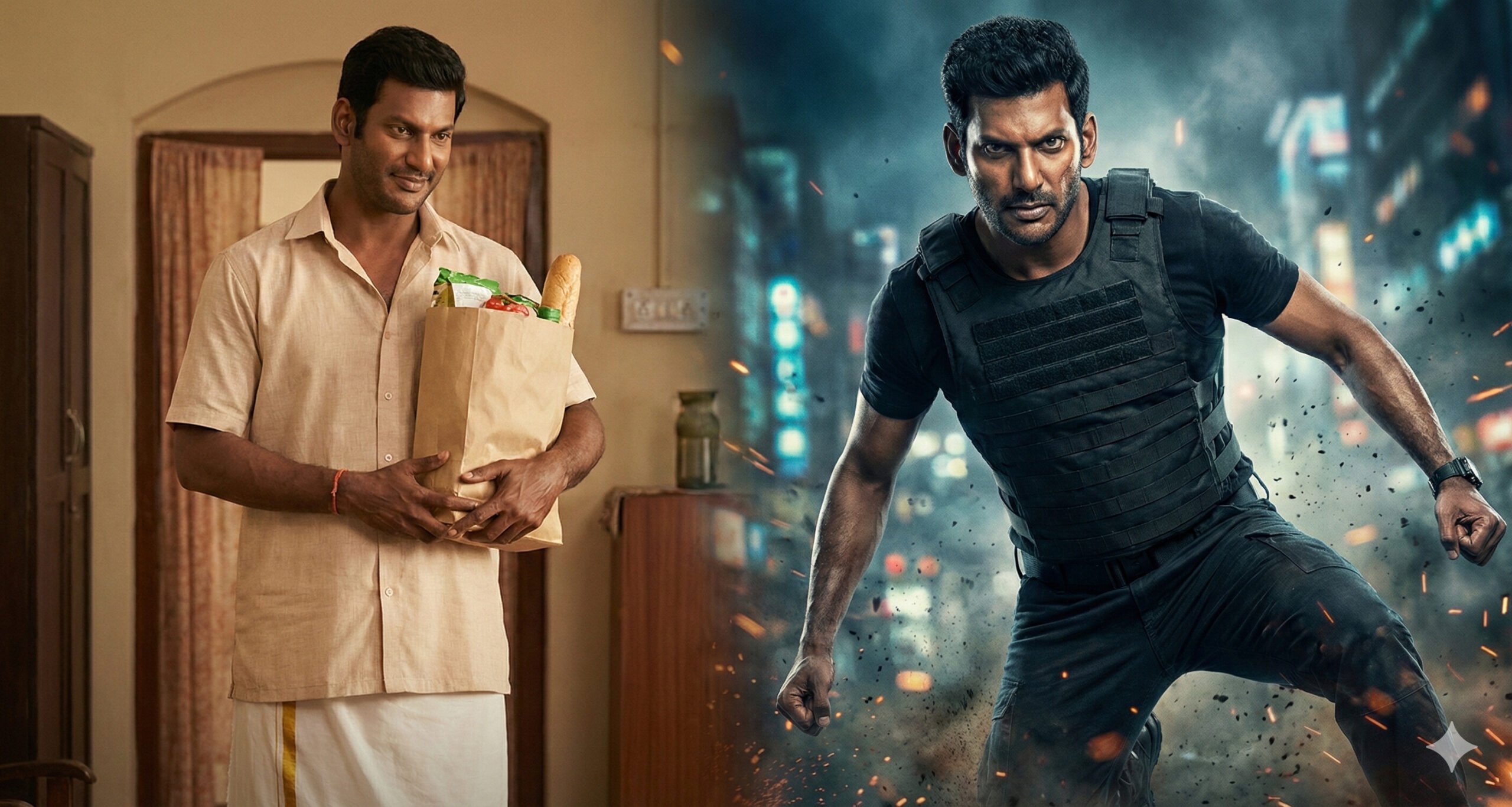 - கதைச் சுருக்கம்: வீட்டில் மனைவியிடம் மிகவும் சாதுவான, அடக்கமான கணவனாகத் தோற்றமளிக்கும் விஷால், வீட்டிற்கு வெளியே ஒரு மிகப்பெரிய ஆக்ஷன் ஹீரோவாக (Violent side) மறைந்து வாழ்கிறார்.