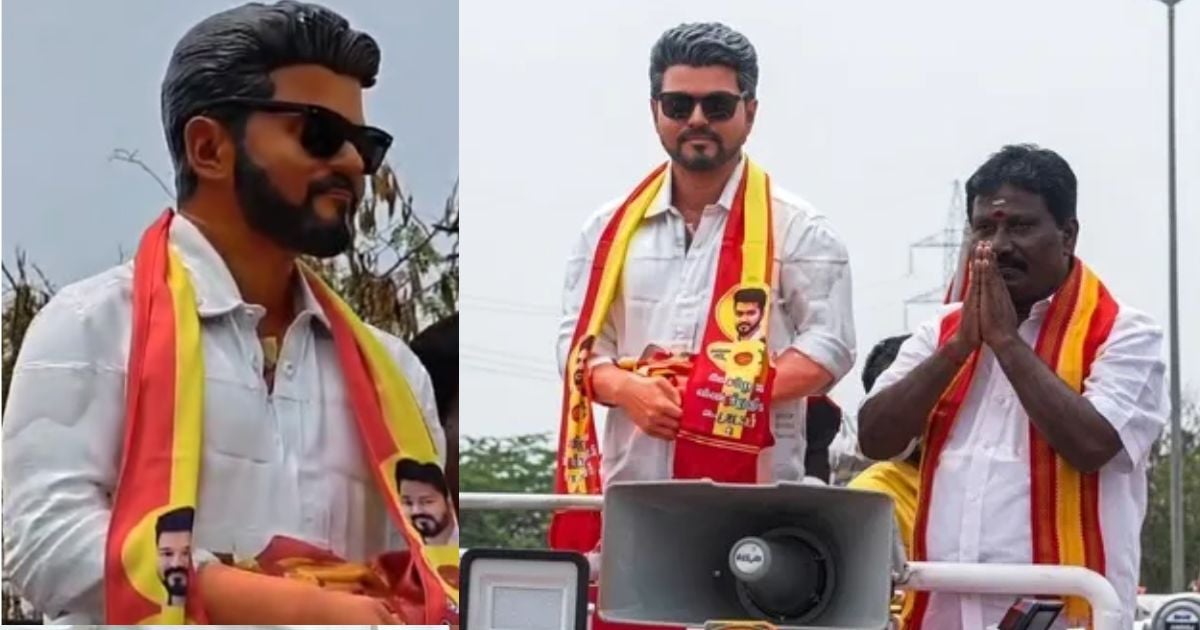 விஜய்யின் உருவ பொம்மையை வைத்து தவெகவினர் வாக்கு சேகரிப்பில் ஈடுபட்டுள்ள சம்பவம் தேர்தல் களத்தில் கவனம் ஈர்த்துள்ளது.