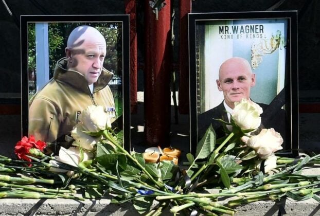 விமான விபத்தில் பலியான யெவ்ஜெனி ப்ரிகோஜின் மற்றும் டிமிட்ரி உட்கின் ஆகியோரின் புகைப்படங்களுக்கு செயின்ட் பீட்டர்ஸ்பர்க்கில் உள்ள தங்களது அமைப்பின் தலைமையகத்திற்கு வெளியே வாக்னர் படை வீரர்கள் அஞ்சலி செலுத்தியுள்ளனர்.