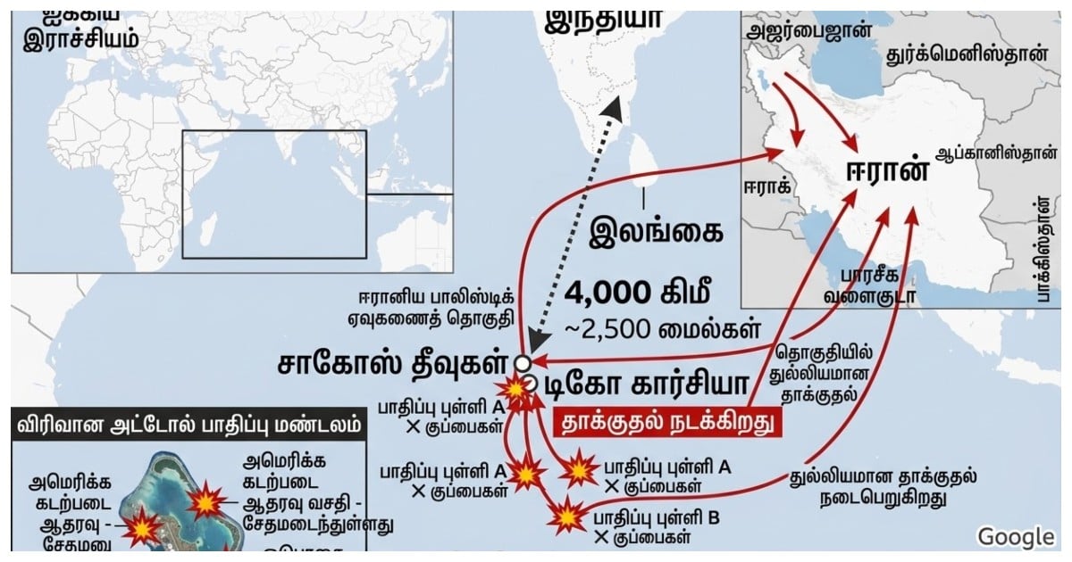அமெரிக்கா-இஸ்ரேல் கூட்டணிக்கும் ஈரானுக்கும் இடையிலான போர் தீவிரமடைந்துள்ளது. இந்தப் பதற்றத்தின் உச்சமாக, இந்தியப் பெருங்கடலில் அமைந்துள்ள அமெரிக்க-பிரிட்டிஷ் கூட்டு ராணுவத் தளமான டிகா கார்சியோ (Diego Garcia) மீது ஈரான் இன்று மார்ச் 21ந் தேதி இரண்டு நடுத்தர தூர பாலிஸ்டிக் ஏவுகணைகளை வீசித் தாக்கிய சம்பவம் பெரும் அதிர்ச்சியை ஏற்படுத்தி உள்ளது.