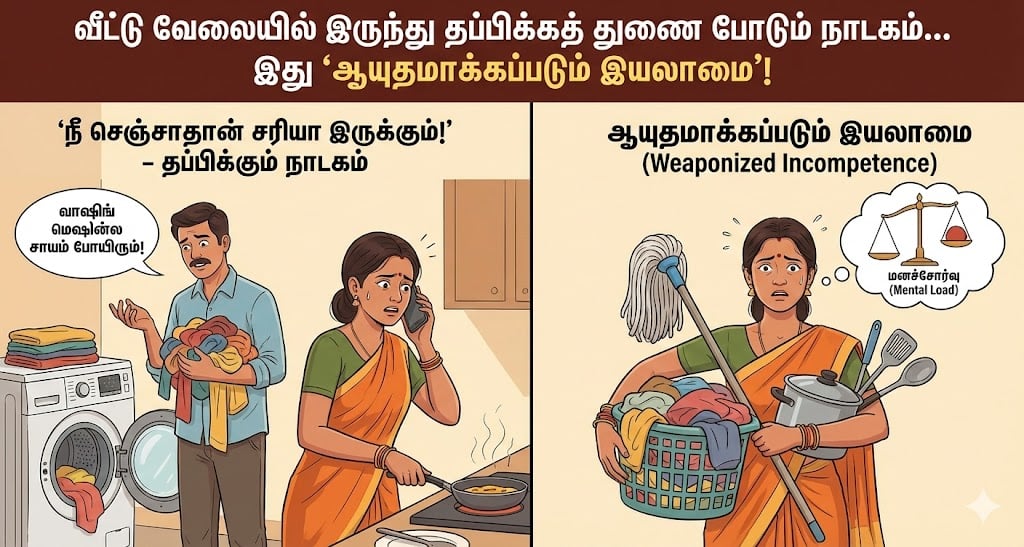 இதைப் கேட்கும்போது, “பரவாயில்லை, என் துணை என்னை நம்புகிறார்,” என்று உங்களுக்குத் தோன்றலாம். ஆனால், உளவியல் நிபுணர்கள் இதை ‘Weaponized Incompetence‘ (ஆயுதமாக்கப்படும் இயலாமை) என்கிறார்கள். அதாவது, ஒரு வேலையைச் செய்யத் தெரியும், ஆனால் தெரியாதது போலவோ அல்லது மோசமாகச் செய்தோ, அந்த வேலையில் இருந்து நிரந்தரமாகத் தப்பிப்பது.
