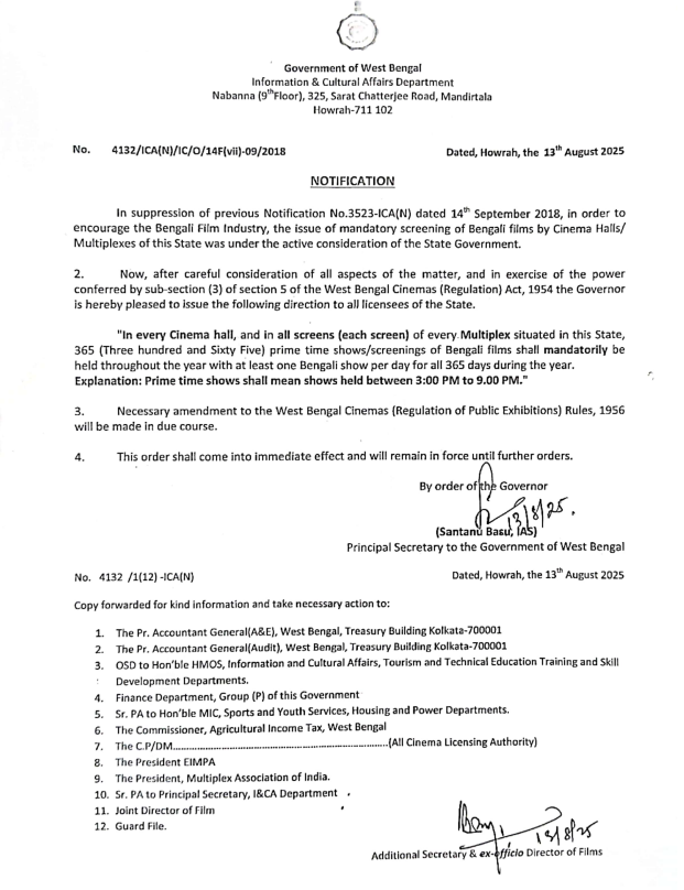 அம்மாநில அரசு வெளியிட்டுள்ள உத்தரவில், ‘பிரைம் டைமில் ஒவ்வொரு திரையரங்கிலும் பெங்காலி மொழிப் படங்கள் மட்டுமே திரையிடப்பட வேண்டும்’ என்று குறிப்பிடப்பட்டிருக்கிறது.