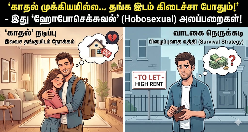 கேட்பதற்கு விசித்திரமாக இருந்தாலும், உலகம் முழுவதும் இப்போது ‘ஹோபோசெக்சுவல்‘ (Hobosexual) என்ற புதிய வகை டேட்டிங் கலாச்சாரம் பரவி வருகிறது. வீடுகளின் வாடகை விண்ணைத் தொடும் இந்த 2026-ம் ஆண்டில், வாடகையை மிச்சப்படுத்தவே சிலர் காதலிப்பது போல நடிக்கிறார்கள் என்பதுதான் அதிர்ச்சித் தகவல்.