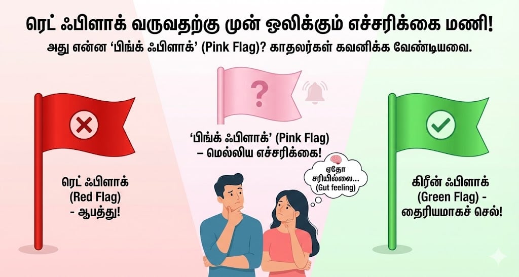 அது என்ன ‘பிங்க் ஃபிளாக்’? இது ஒரு ‘மெல்லிய எச்சரிக்கை’ (Subtle Warning). உங்கள் துணையின் நடவடிக்கை உங்களுக்குப் பெரிய பிரச்சனையாகத் தெரியாது. ஆனால், உங்கள் அடிமனதில் “ஏதோ சரியில்லை” (Gut feeling) என்று ஒரு நெருடல் இருக்கும். அதுதான் பிங்க் ஃபிளாக்.