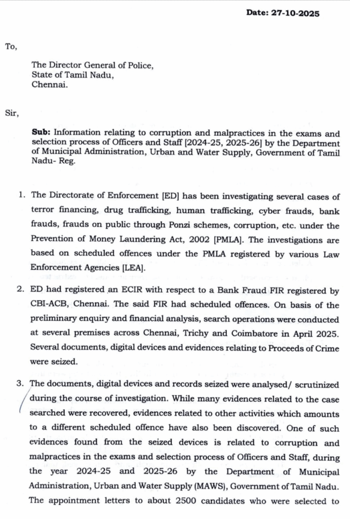 ஆமாம்.. அந்த கடிதத்துல, ” : 2024-25 மற்றும் 2025-26 ஆம் ஆண்டுகளுக்கான நகராட்சி நிர்வாகம் மற்றும் குடிநீர் வழங்கல் துறையில் உதவிப் பொறியாளர்கள், இளநிலைப் பொறியாளர்கள், நகர திட்டமிடல் அதிகாரிகள், சுகாதார ஆய்வாளர்கள் உள்ளிட்ட 2,538 அதிகாரிகள் மற்றும் பணியாளர்கள் நியமனங்களில் முறைகேடுகள் நடந்துருக்கு.. வ்வொரு பணிக்கும் ₹25 லட்சம் முதல் ₹35 லட்சம் வரை லஞ்சம் வாங்கி இருக்காங்க..