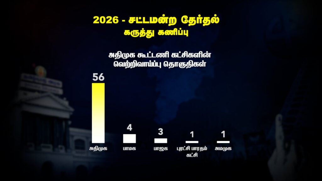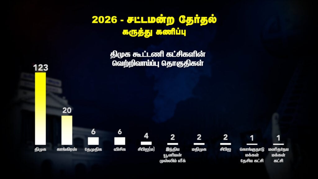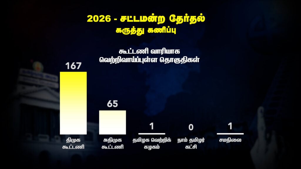 மக்களிடம் பெற்ற கருத்துகளின் அடிப்படையில் நமது சர்வே முடிவுகளை வெளியிட்டுள்ளோம். தமிழக சட்டசபை தேர்தல் ஏப்ரல் 23-ந் தேதி நடைபெறுகிறது; வாக்குகள் மே 4-ந் தேதி எண்ணப்பட்டு முடிவுகள் அறிவிக்கப்படுகிறது. மக்களின் இறுதியான முடிவு அன்றைய நாளில் வெளிப்படும்.