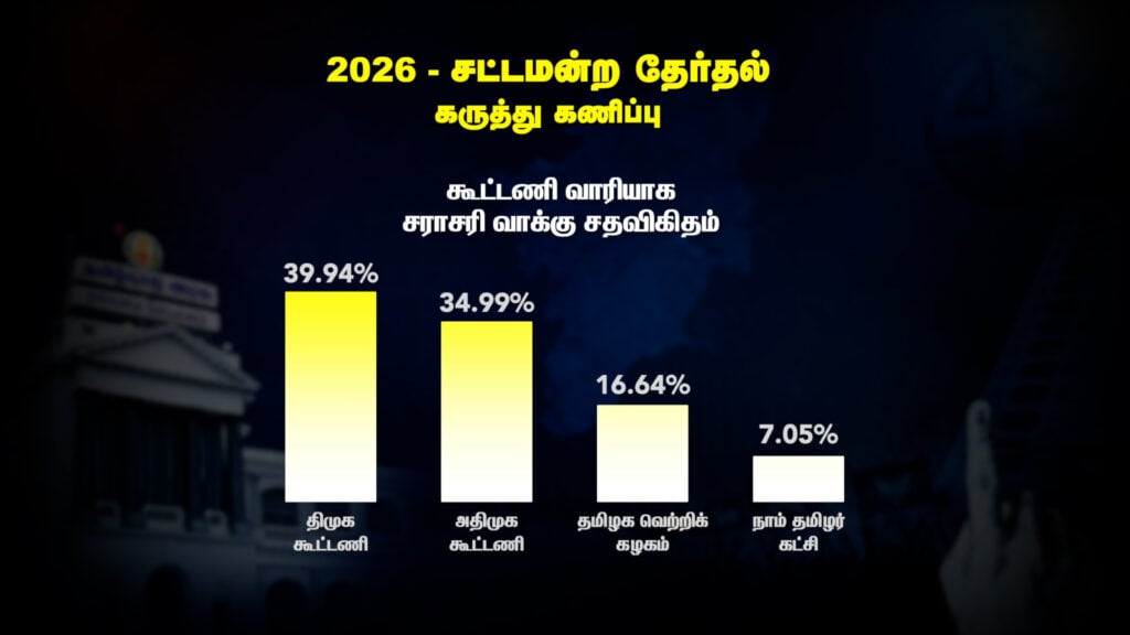 என வரிசைப்படுத்தி கேட்டால் இரண்டில் ஒருவர் 50%-க்கும் அதிகமானோர் முதல்வர் ஸ்டாலின் பெயரை சொல்கின்றனர்.முதல்வராக ஸ்டாலின் இருக்க வேண்டும் என விரும்புகிறவர்கள் பெரும்பான்மையினராக இருந்தாலும் “நீங்க எந்த கட்சிக்கு ஓட்டு போடுவீங்க”ன்னு கேட்டா குறிப்பிட்ட சதவீதம் பேர் அவர்கள் விரும்புகிற மாற்றுக் கட்சிக்கு ஓட்டுப் போட்டனர்.