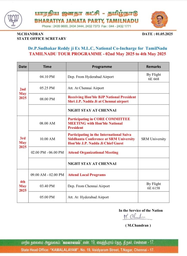 இதனால் மே 4-ஆம் தேதி காலை 9 மணியிலிருந்து மதியம் 2 மணி வரை முக்கிய பிரமுகர்களை சந்திப்பது, சென்னை ராயப்பேட்டையில் உள்ள அதிமுக தலைமை அலுவலகத்திற்கு சென்று ஜெயலலிதா சிலைக்கு மாலை அணிவித்து மரியாதை செலுத்துவது, அதிமுக பொதுச்செயலாளர் எடப்பாடி பழனிசாமியை சந்திப்பதாக திட்டம் இருந்தது. மாலை 3.40-க்கு சென்னை விமான நிலையத்தில் இருந்து 6E 6158 விமானத்தில் ஹைதராபாத் செல்ல திட்டமிட்டிருந்தார்.