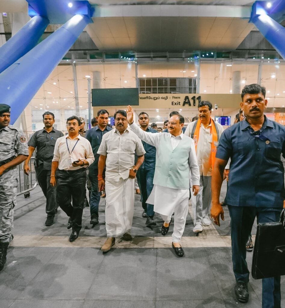பாஜக தேசிய தலைவர் ஜே.பி.நட்டா மே 2-ஆம் தேதி இரவு சென்னை வந்தார். அவருக்கு பாஜக மாநில தலைவர் நயினார் நாகேந்திரன் தலைமையில், உற்சாக வரவேற்பு அளிக்கப்பட்டது.