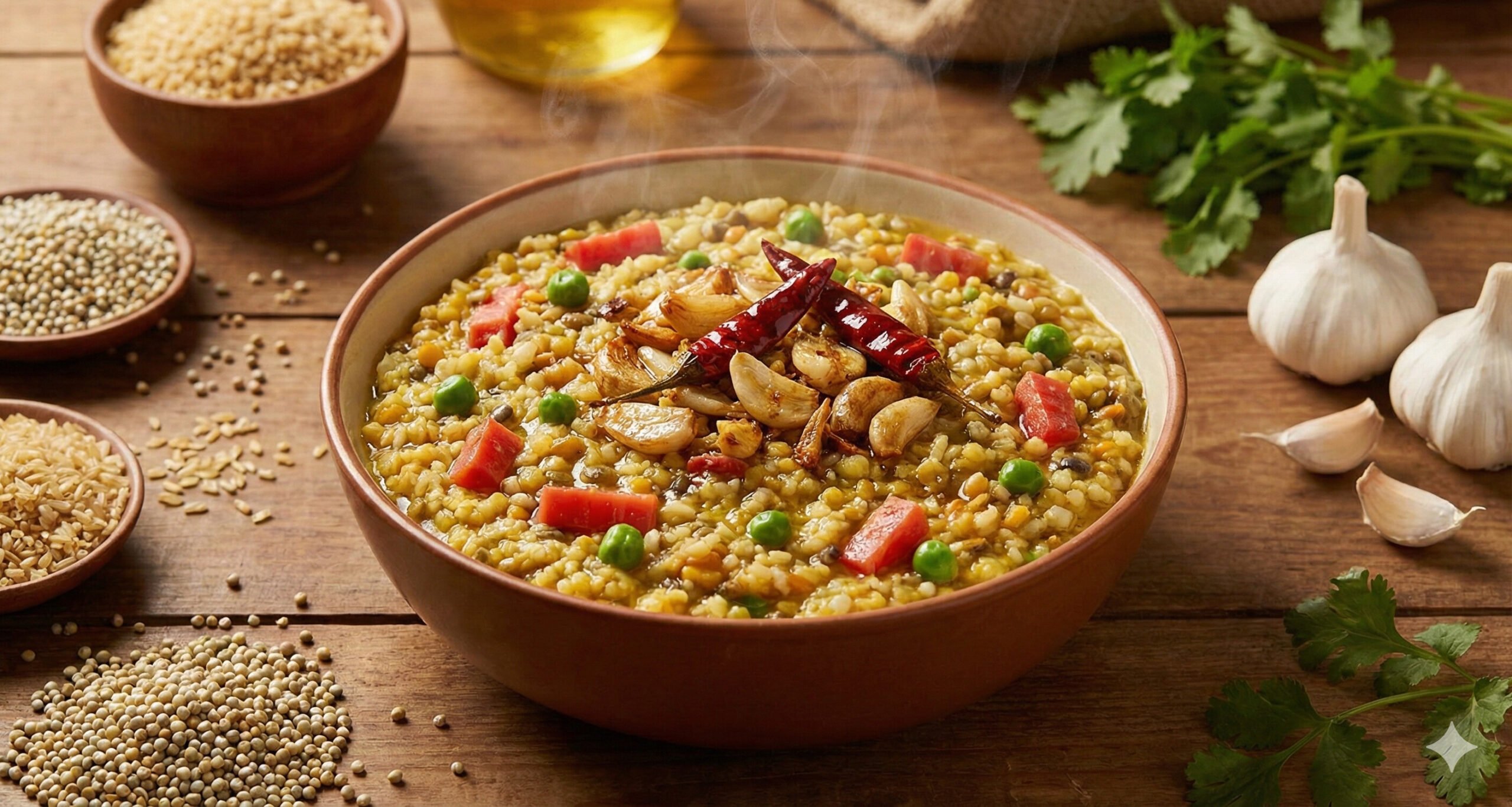 இந்தக் கிச்சடியின் சுவையை அடுத்த கட்டத்திற்குக் கொண்டு செல்வது அதன் தாளிப்பு (Tadka) முறைதான். நெய்யில் சீரகம், பெருங்காயம் மற்றும் காய்ந்த மிளகாயுடன் சேர்த்து, பொடியாக நறுக்கப்பட்ட அதிகப்படியான பூண்டைப் போட்டுத் தாளிக்கும் இந்த Double-Garlic Tadka முறை ஒரு அபாரமான மணத்தைக் கொடுக்கும். பூண்டு உடலில் வெப்பத்தை நிலைநிறுத்த உதவுவதால், கடும் குளிருக்கு இது ஒரு சிறந்த தேர்வாகும்.