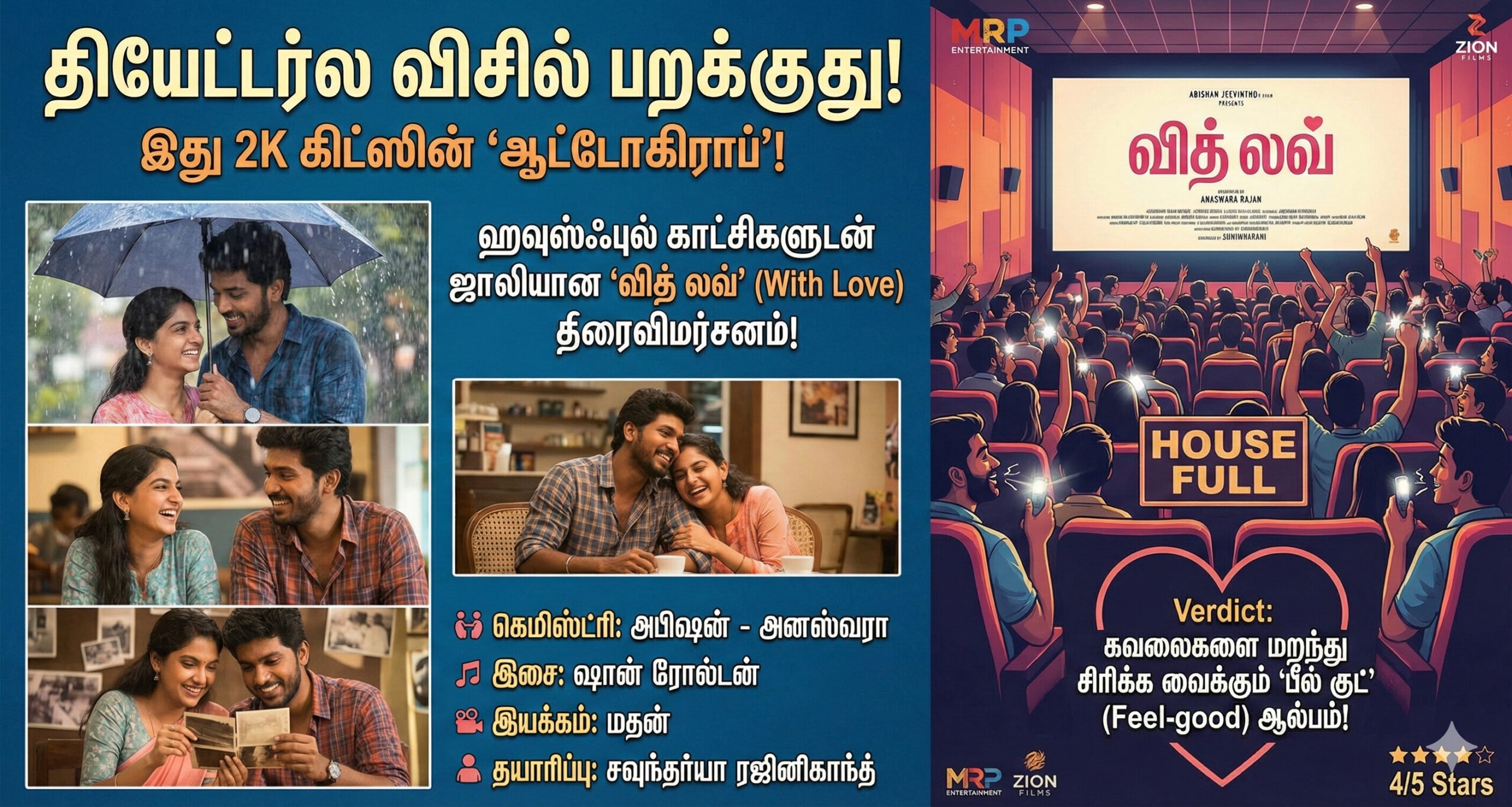 ரத்தம் தெறிக்கும் ஆக்ஷன் படங்களுக்கு நடுவே, நீண்ட நாட்களுக்குப் பிறகு தமிழுக்கு ஒரு அழகான, மென்மையான காதல் படம் கிடைத்திருக்கிறது. சவுந்தர்யா ரஜினிகாந்த் (MRP Entertainment) மற்றும் ஜியோன் ஃபிலிம்ஸ் தயாரிப்பில், இயக்குநர் மதன் இயக்கத்தில் இன்று வெளியாகியுள்ள படம் ‘வித் லவ்’ (With Love).