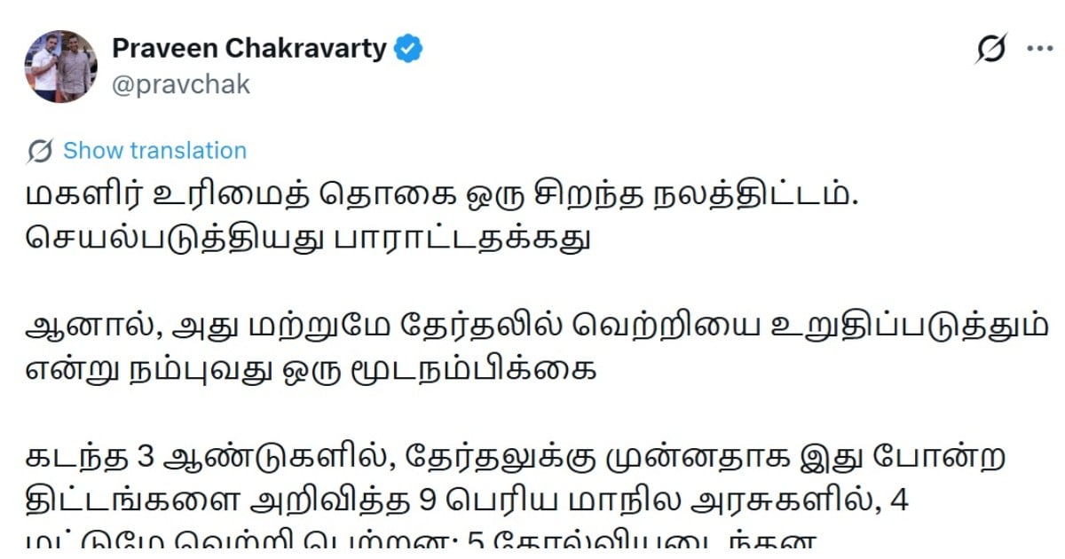 பிரவீன் சக்கரவர்த்தி தமது எக்ஸ் பக்கத்தில் பதிவிட்டுள்ளதாவது: மகளிர் உரிமைத் தொகை ஒரு சிறந்த நலத்திட்டம். செயல்படுத்தியது பாராட்டதக்கது ஆனால், அது மட்டுமே தேர்தலில் வெற்றியை உறுதிப்படுத்தும் என்று நம்புவது ஒரு மூடநம்பிக்கை கடந்த 3 ஆண்டுகளில், தேர்தலுக்கு முன்னதாக இது போன்ற திட்டங்களை அறிவித்த 9 பெரிய மாநில அரசுகளில், 4 மட்டுமே வெற்றி பெற்றன; 5 தோல்வியடைந்தன. இவ்வாறு பிரவீன் சக்கரவர்த்தி தெரிவித்துள்ளார்.
