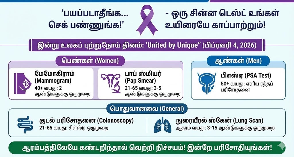 இன்று (பிப்ரவரி 4, 2026) உலகப் புற்றுநோய் தினம் (World cancer Day). இந்த ஆண்டின் மையக்கருத்து (Theme) “United by Unique” என்பதாகும். அதாவது, ஒவ்வொருவரின் புற்றுநோய் அனுபவமும் தனித்துவமானது; ஆனால் நாம் அனைவரும் ஒன்றிணைந்து செயல்பட்டால் இதை வெல்ல முடியும்.